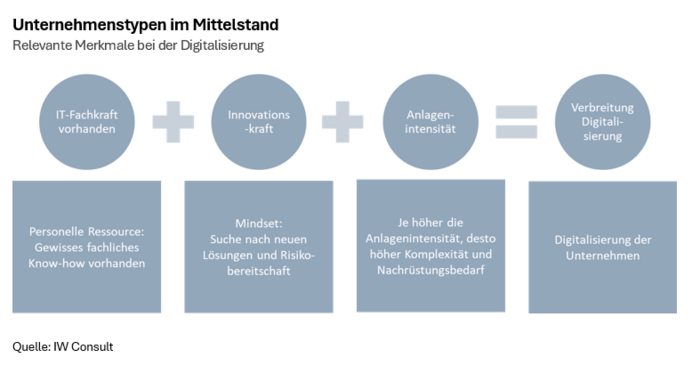 In der Analyse zeigen sich Einflussfaktoren abseits von Unternehmensgröße und Branche: Relevant sind vielmehr die Anlagenintensität und Innovationskraft sowie das Vorhandensein einer IT-Fachkraft. Bei der Art der Digitalisierung wird zwischen Quick Wins, komplexeren Prozessen und digitalen Geschäftsmodellen unterschieden. So können Hemmnisse zugeordnet und zukünftige Potenziale der Digitalisierung aufgezeigt werden.