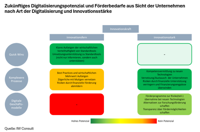 So haben innovationsfernere Unternehmen zukünftig vor allem Potenziale bei der Realisierung von Quick Wins. Aber auch bei der Einführung von Standardtools, die über Plug-and-Play-Lösungen hinausgehen, fehlen häufig Zeit und Ressourcen, weshalb sie mehr Unterstützungsbedarf haben. Die Digitalisierung komplexerer Prozesse wird nur für einen kleineren Teil innovationsfernerer Unternehmen relevant, vor allem dann, wenn die Mehrwerte der digitalen Lösungen aufgezeigt klar werden können. Die Einführung digitaler Geschäftsmodelle ist von innovationsferneren Unternehmen zukünftig kaum zu erwarten.
