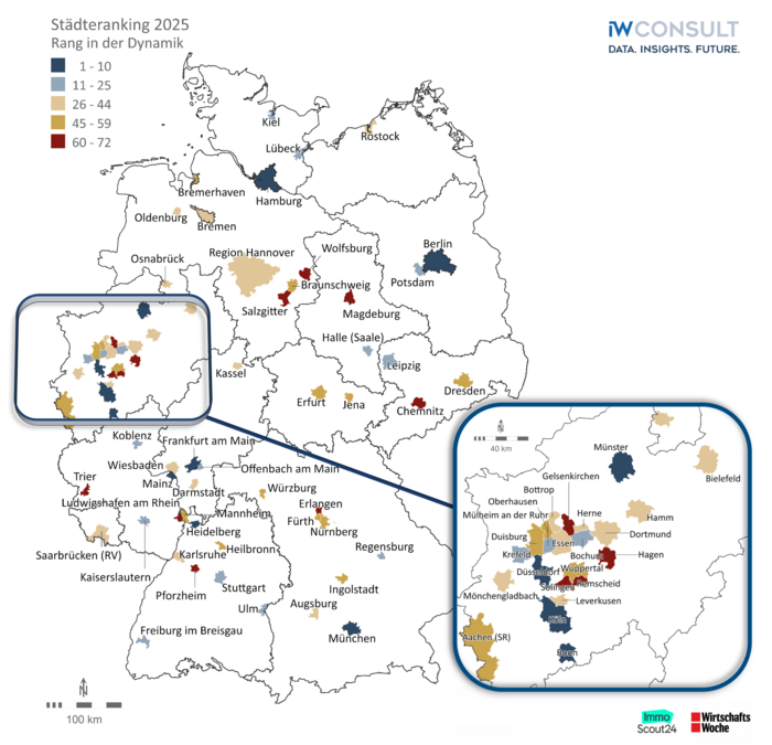 Im neuen Index liegt Potsdam insgesamt an erster Stelle. Die Stadt punktet besonders im Bereich Forschung. Die beste Stadt im Bereich Verkehr ist Frankfurt am Main. Die Bildungsstadt Nummer 1 ist hingegen Freiburg im Breisgau. Ingolstadt führt im Bereich Digitales. Im Bereich Klima ist die Donau-Stadt Ulm dank eines hohen Ausbaustandes bei Photovoltaikanlagen und Ladesäulen Spitzenreiterin. Einer der neuen Indikatoren ist das Klimarisiko für die städtische Infrastruktur. In diesem Bereich steht Remscheid an der Spitze.